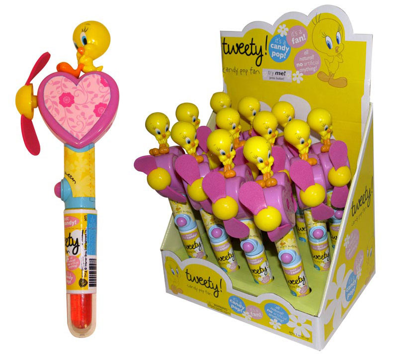 Item 4544: Tweety looks cute as the powerful, child safe fan spins. Lollipop in the handle. All natural, nothing artificial! Packed (6) 12 count displays per case