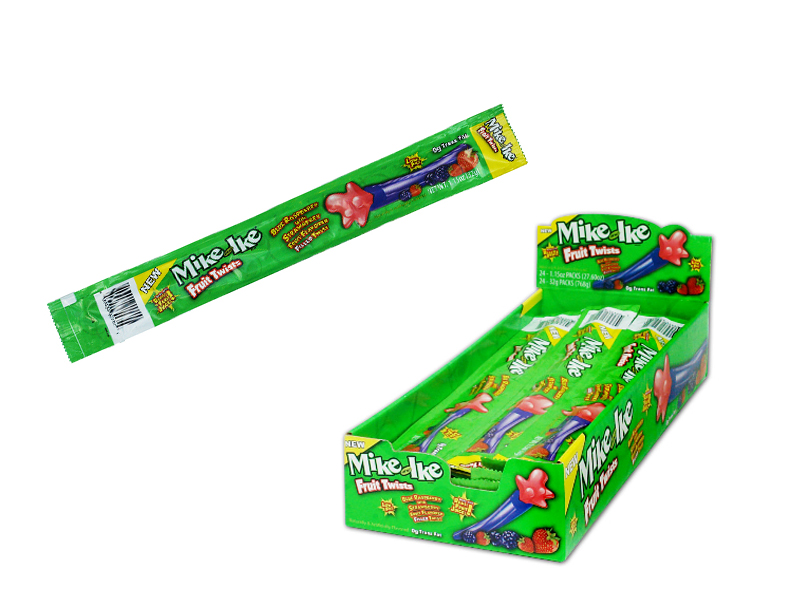 Item 32284- Mike & Ike Fruit Twist rope in the fun flavors of Blue Raspberry/Strawberry! Packed (12) 24 count displays per box.